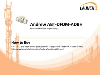 This document provides product information and purchasing details for the Andrew ABT-DFDM-ADBH Dual Band Bias Tee Surge Arrestor. Key details include:
