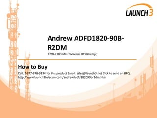 This document provides information about purchasing an Andrew ADFD1820-90B-R2DM 1710-2180 MHz Wireless BTS antenna from Launch 3 Telecom. It lists contact information for purchasing, describes same day shipping and order tracking, and provides details on the warranty. Additional services offered by Launch 3 Telecom include equipment repair, maintenance contracts, de-installation, asset recovery, and third party logistics.