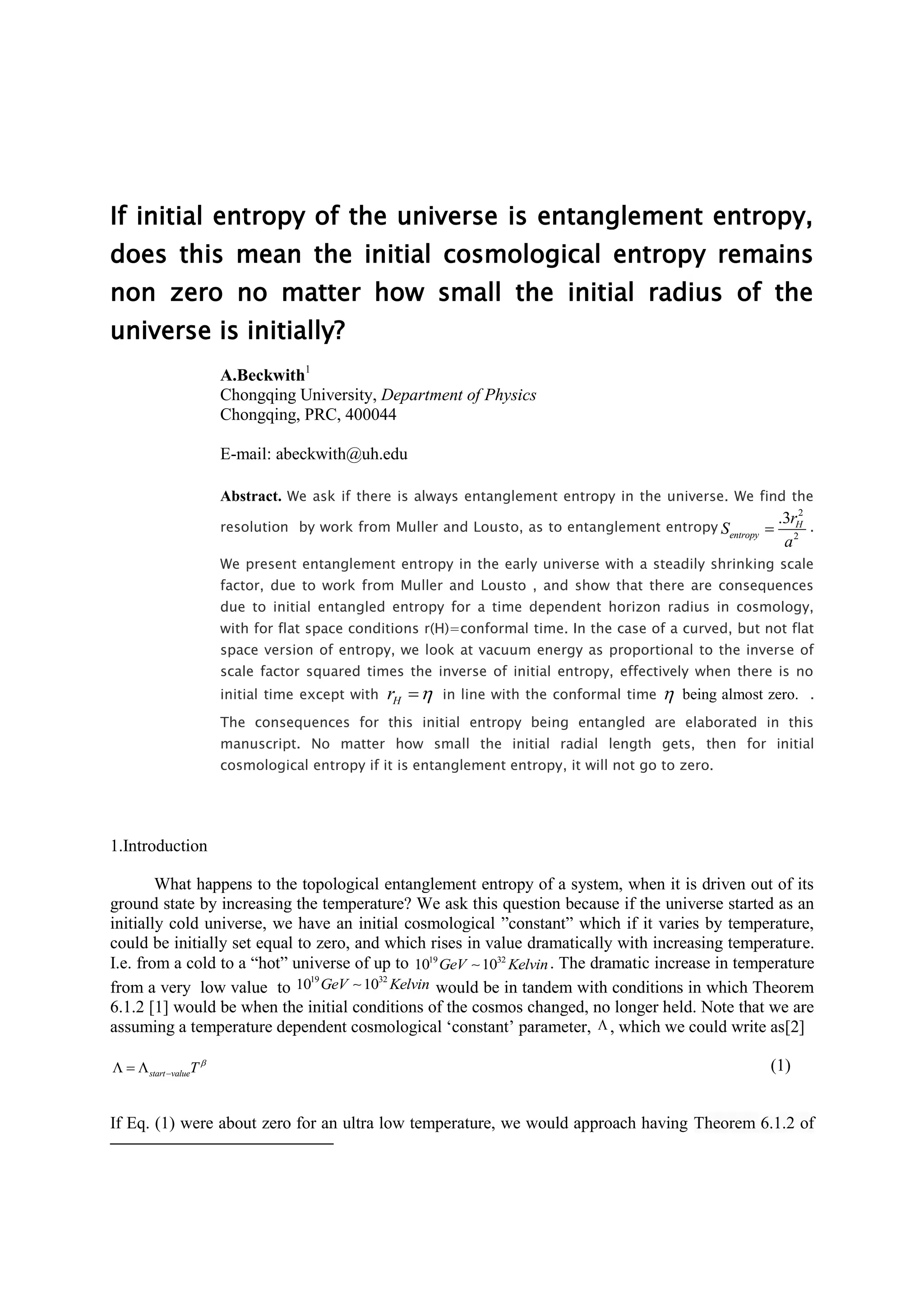 This document investigates the implications of initial entanglement entropy in the universe, asserting that it remains non-zero regardless of the initial radius of the universe. It explores theories related to cosmological constants, singularity theorems, and the transfer of information from prior universes through quantum entanglement, specifically within the framework of cyclic conformal cosmology. The findings suggest that initial entanglement entropy is crucial for avoiding singularities at the universe's beginning, thereby ensuring a finite and non-zero cosmological entropy.