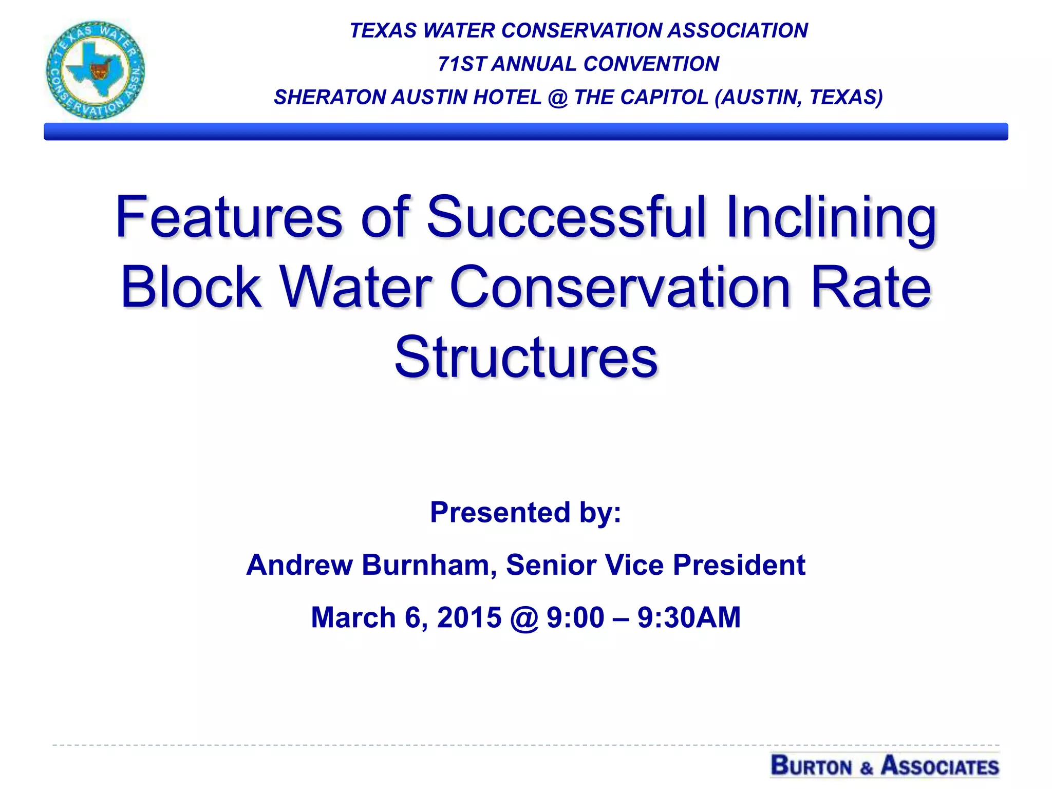 This document summarizes key features of successful inclining block water conservation rate structures. It discusses balancing priorities like sustainability, conducting a cost of service analysis, developing conservation rates, financial considerations like reserve policies and fixed cost recovery, examples of block sizing and pricing, and modeling changes in demand from price elasticity. The overall presentation provides guidance on effectively designing and implementing inclining block water rates to promote both conservation and financial sustainability.