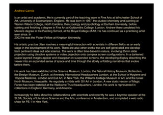 Andrew Carnie is a British artist and academic who works in fine art. He often collaborates with scientists to incorporate scientific concepts and research into his artwork. Some of his most notable time-based works that use slide projection include Magic Forest, made in collaboration with neuroscientists about neuron development, and Disperse, exploring ideas about the dispersal of the human body after death. His work has been exhibited widely in museums and galleries in Europe and the United States.