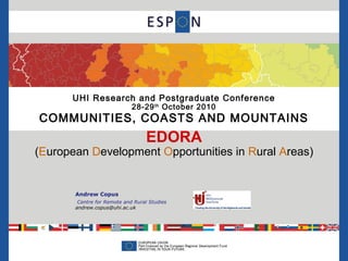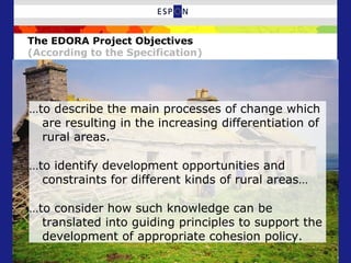 This document summarizes the objectives and findings of the EDORA Project, which studied rural development opportunities across Europe. The project had three main objectives: 1) describe processes changing rural areas, 2) identify development opportunities and constraints, and 3) translate findings into rural policy guidance. It developed typologies to classify rural areas based on accessibility, economic structure, and growth trends. Key findings included that intangible assets like social capital are important for rural areas to capitalize on opportunities from trends like globalization and counterurbanization. The project proposes a "neo-endogenous" rural policy approach that coordinates macro-level regional programs with micro-level audits of local intangible assets to support rural territorial cohesion across Europe