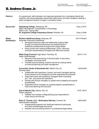 This document is a resume for B. Andrew Evans Jr. that summarizes his education and work experience. He graduated from Gettysburg College with a degree in Management and Psychology. His work experience includes positions in sales, customer service, operations, and lifeguarding. He is seeking a sales management position to begin his career.