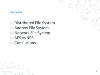 The document summarizes the Andrew File System (AFS), a distributed file system developed at Carnegie Mellon University. It describes the initial prototype of AFS implemented in the 1980s, which used client-server architecture with Venus processes on client workstations caching files from Vice servers. The prototype showed performance bottlenecks due to high server CPU usage from frequent cache validation checks and pathname traversals. Subsequent versions improved performance by reducing cache checks, having clients perform name resolution, using a single server process with lightweight threads, and identifying files by unique IDs instead of pathnames.