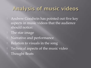 Andrew Goodwin identified five key aspects of music videos that audiences should pay attention to: the star image, narrative/performance, relation to the song's visuals, technical elements, and "thought beats." He also noted that music videos are used to promote songs by illustrating lyrics, amplifying meanings, or disregarding the song's meaning. Technical elements like lighting, editing, and camera work are important for holding the video together and engaging the audience. Music videos also focus heavily on the artist's image through close-ups and sometimes feature voyeuristic portrayals of women to catch viewers' attention.