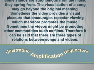 This document discusses different approaches to narrative in pop music videos. It notes that pop videos are built around songs, which do not usually have traditional narrative structures. The singer acts as both narrator and character, often looking at the camera to involve the viewer. Pop videos also rely on repetition of images and familiarity through radio play and television airing. Finally, pop videos reflect the structure of the songs they are based on, usually building to a climax and ending to mirror the 3 minute format of a single.