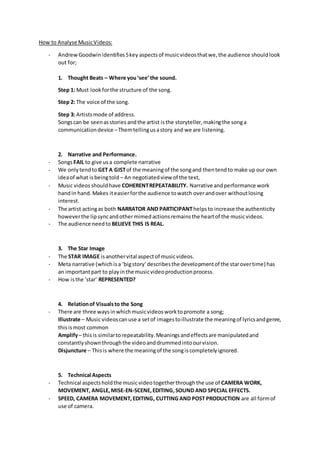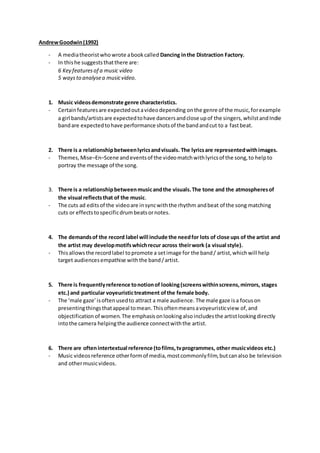 1. Andrew Goodwin identified 6 key features and 5 ways to analyze music videos in his book "Dancing in the Distraction Factory".