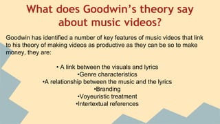 Goodwin's theory analyzes key features of music videos that help promote artists and sell music. These include linking visuals to lyrics to reinforce or draw attention away from the message; using genre-specific visual cues and pacing to identify the music style; branding artists with distinctive imagery to promote recognition; objectifying female artists through close-ups to draw larger audiences; and including references to other works to help viewers relate to the artist and music.