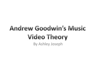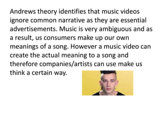 Andrews' theory is that music videos are essentially advertisements meant to create specific meanings for songs, rather than illuminate inherent meanings. Music videos can depict genre characteristics through imagery like dance routines or aspirations. They also often relate the visuals directly to song lyrics, or amplify meanings beyond the lyrics. Record labels influence music videos to feature artists prominently and appeal sexually to promote sales.