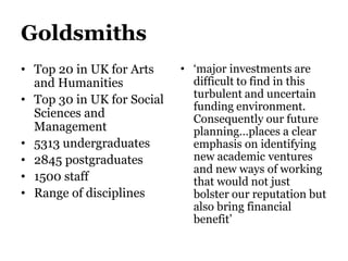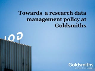 This document summarizes Goldsmiths' efforts to develop a research data management policy. A working group was formed to review existing policies, discuss data storage and training. They drafted a policy addressing the research data lifecycle, responsibilities of researchers, and the college's role in preserving access to data. A data repository was also created. Key recommendations include identifying stakeholders, being practical, and tying the policy to the university's strategic goals. The overall aim is to improve research support through better research data management.