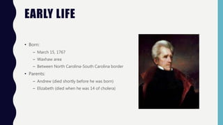 Andrew Jackson was the 7th US President, known as the "People's President". He grew up in South Carolina and fought in the Revolutionary War as a teenager. As President, he implemented the policy of rotating political appointments and eliminated the national debt. However, he also enacted the Indian Removal Act, which forced Native American tribes to relocate west of the Mississippi and led to the devastating Trail of Tears. Throughout his life, Jackson was known for his fiery temper and participated in several duels, including one in which he killed a man who insulted his wife.