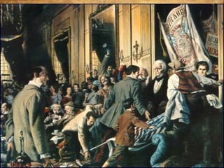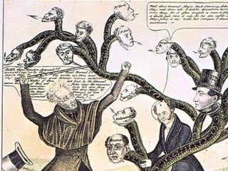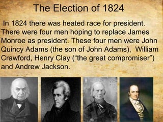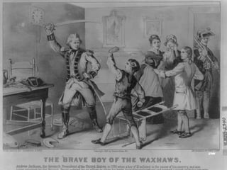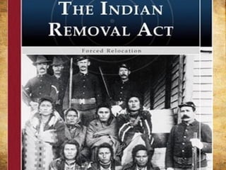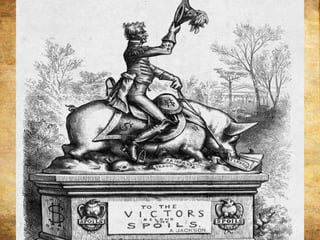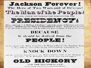 The document summarizes key events during Andrew Jackson's presidency and the rise of Jacksonian democracy. It describes how Jackson appealed to common workers and farmers in his campaigns. His supporters saw him as representing the interests of average citizens over the wealthy elite. As president, Jackson fired many government officials and replaced them with political allies, establishing the spoils system. He also signed the Indian Removal Act, leading to the forced relocation of Native Americans and the tragic Trail of Tears. Sectional divisions between North and South grew over tariffs and states' rights during Jackson's two terms.