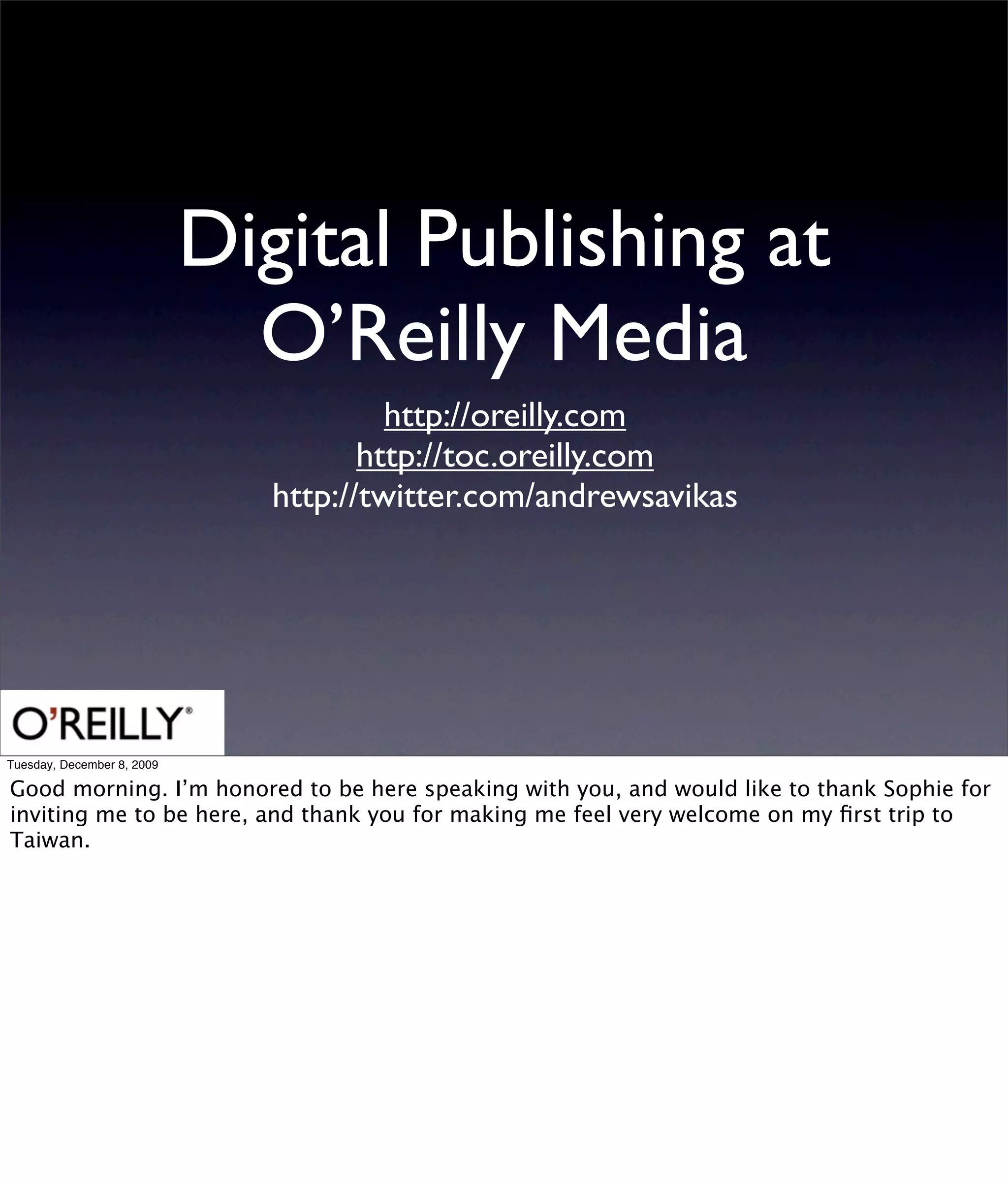 The document summarizes a talk given by Andrew Savikas at O'Reilly Media about digital publishing trends. Some key points include: