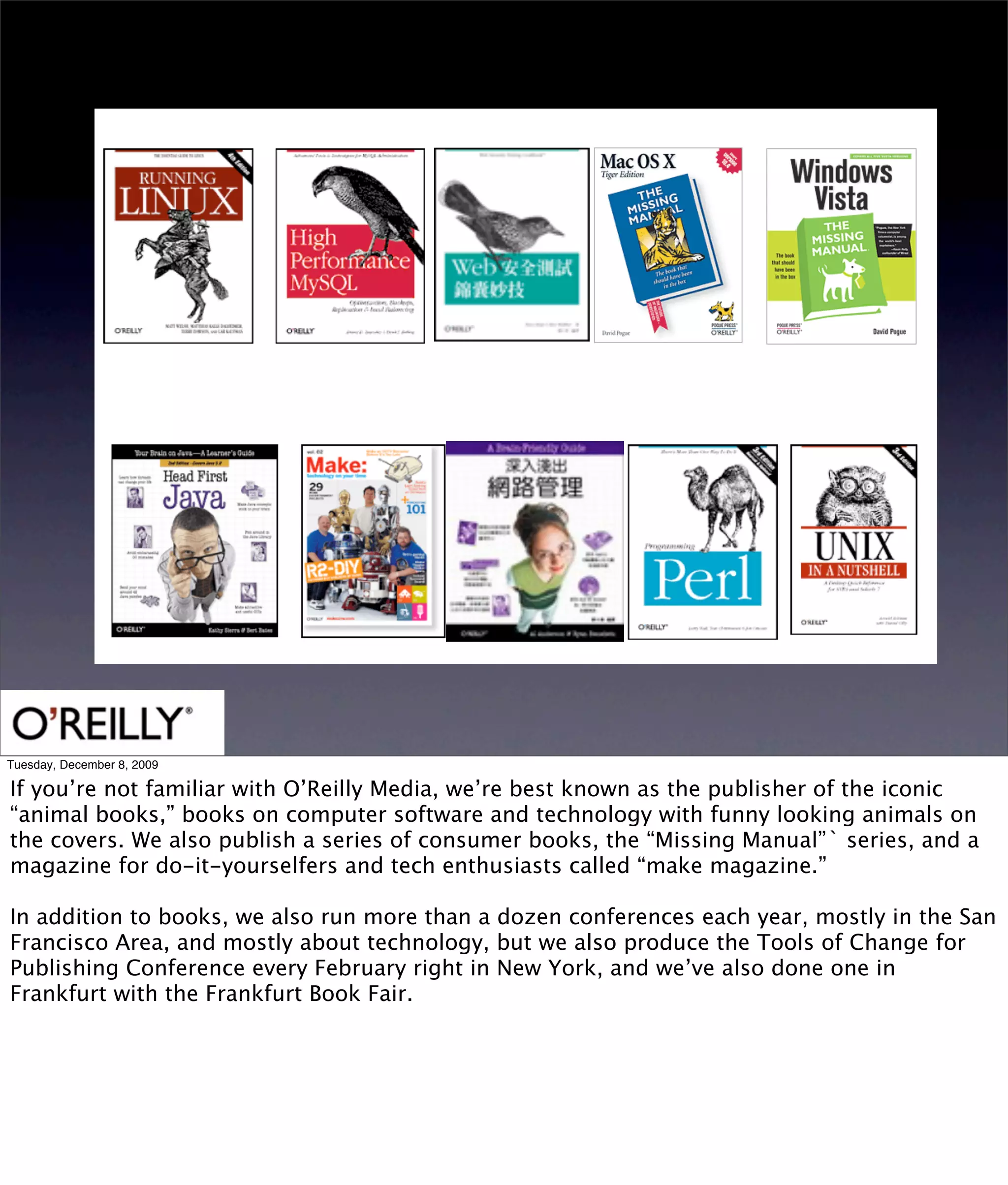 - O'Reilly is expanding into mobile publishing with over 500 apps and strong sales of technical books on iPhone and other mobile devices. Readers are consuming complex technical content on mobile.