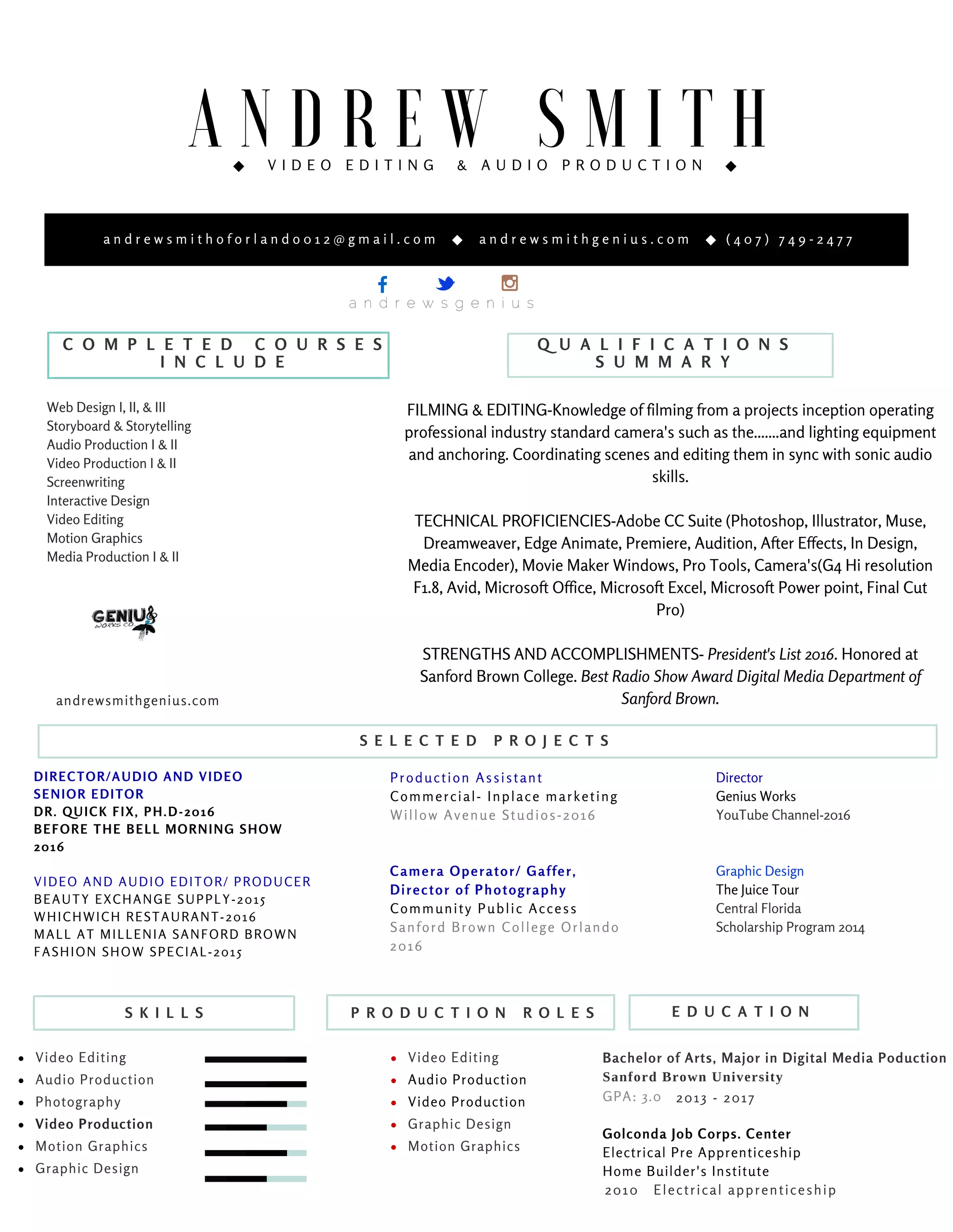 Andrew Smith is a skilled video editor and audio producer with expertise in using various industry-standard software and equipment. He has received multiple honors, including being on the President's List in 2016 and winning the Best Radio Show award from Sanford Brown College. His education includes a Bachelor of Arts in Digital Media Production and he has experience directing and editing projects across various media platforms.