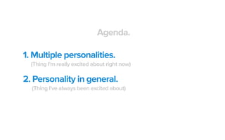 The document discusses multiple personality disorder and organizing tasks in Asana. It includes an agenda with topics about multiple personalities and personality in general. It then shows examples of Asana tasks, comments, and projects for recruiting and marketing. The document suggests balancing simplicity and power when organizing and using technology.