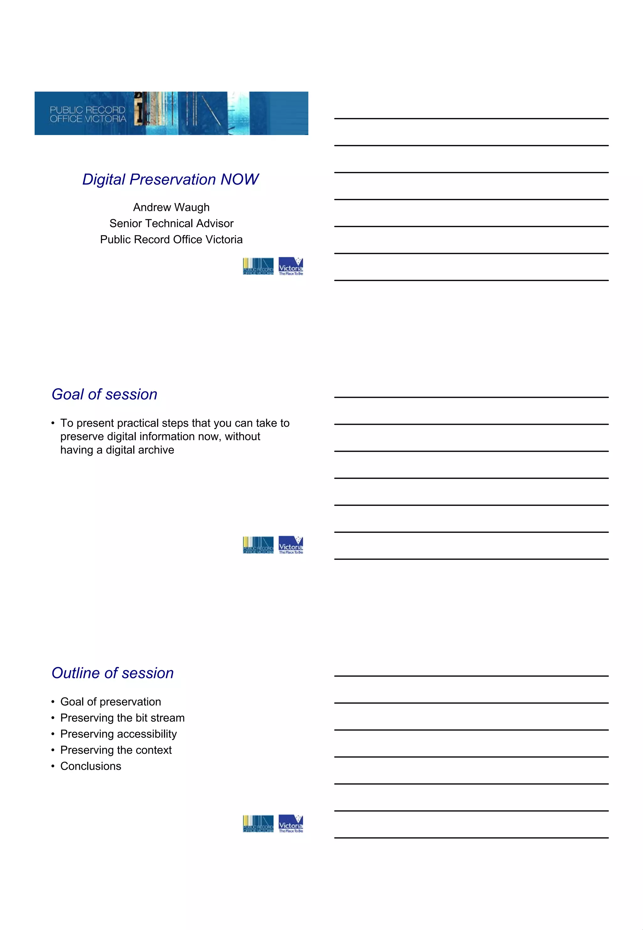 This document provides an overview of practical steps organizations can take to preserve digital information without a full digital archive program. It discusses preserving the bitstream by ensuring proper storage on multiple media types and locations with backups. It also covers preserving accessibility by addressing issues of software and format obsolescence through normalization to long-term preservation formats. Finally, it addresses preserving context by implementing recordkeeping practices like classification systems and metadata capture to maintain authenticity and integrity of records over time. The key recommendations are to survey digital holdings, conduct risk assessments, choose preservation formats, and work towards systems to manage records and their context.