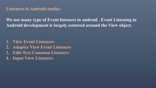 The document details various event listeners used in Android development, categorized into view event listeners, adapter view event listeners, and edit text common listeners. Each listener is defined with its associated event handling method, such as setOnClickListener, setOnItemClickListener, and addTextChangedListener. Additionally, it provides syntax examples demonstrating how to implement these listeners in Java code.