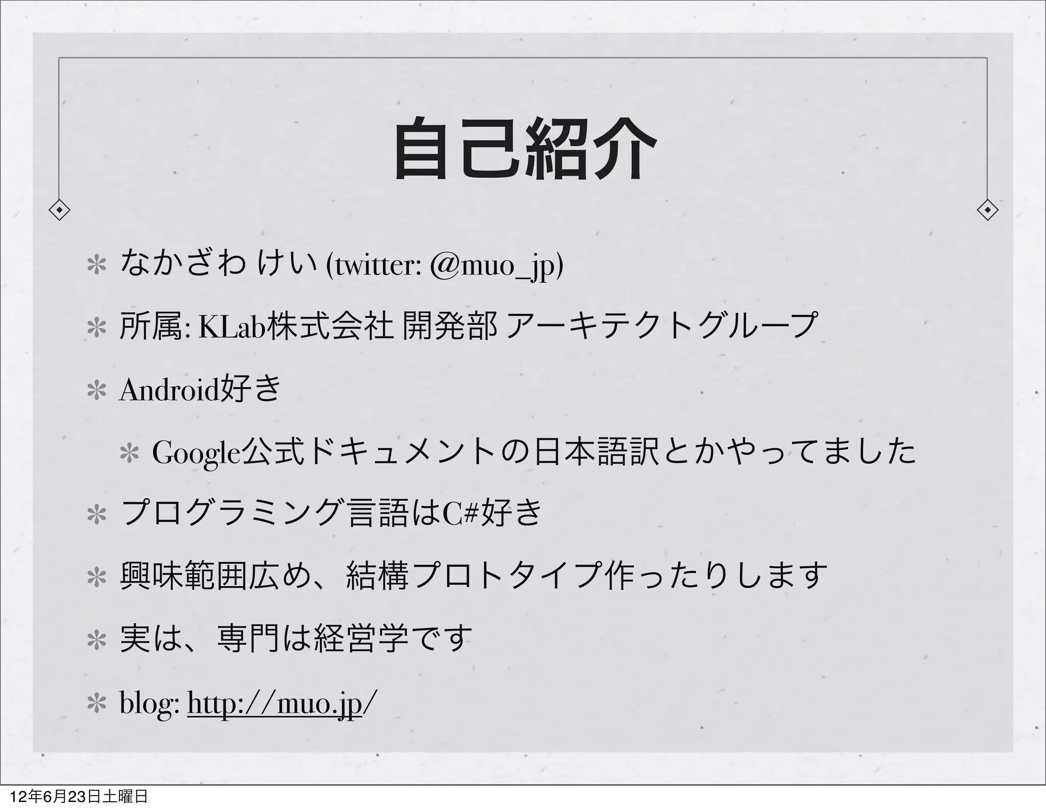なかざわ けい (twitter: @muo_jp) 所属: KLab株式会社 開発部 アーキテクトグループ Android好き Google公式ドキュメントの日本語訳とかやってました プログラミング言語はC#好き 興味範囲広め、結構プロトタイプ作ったりします 実は、専門は経営学です blog: http://muo.jp/ 12年6月23日土曜日