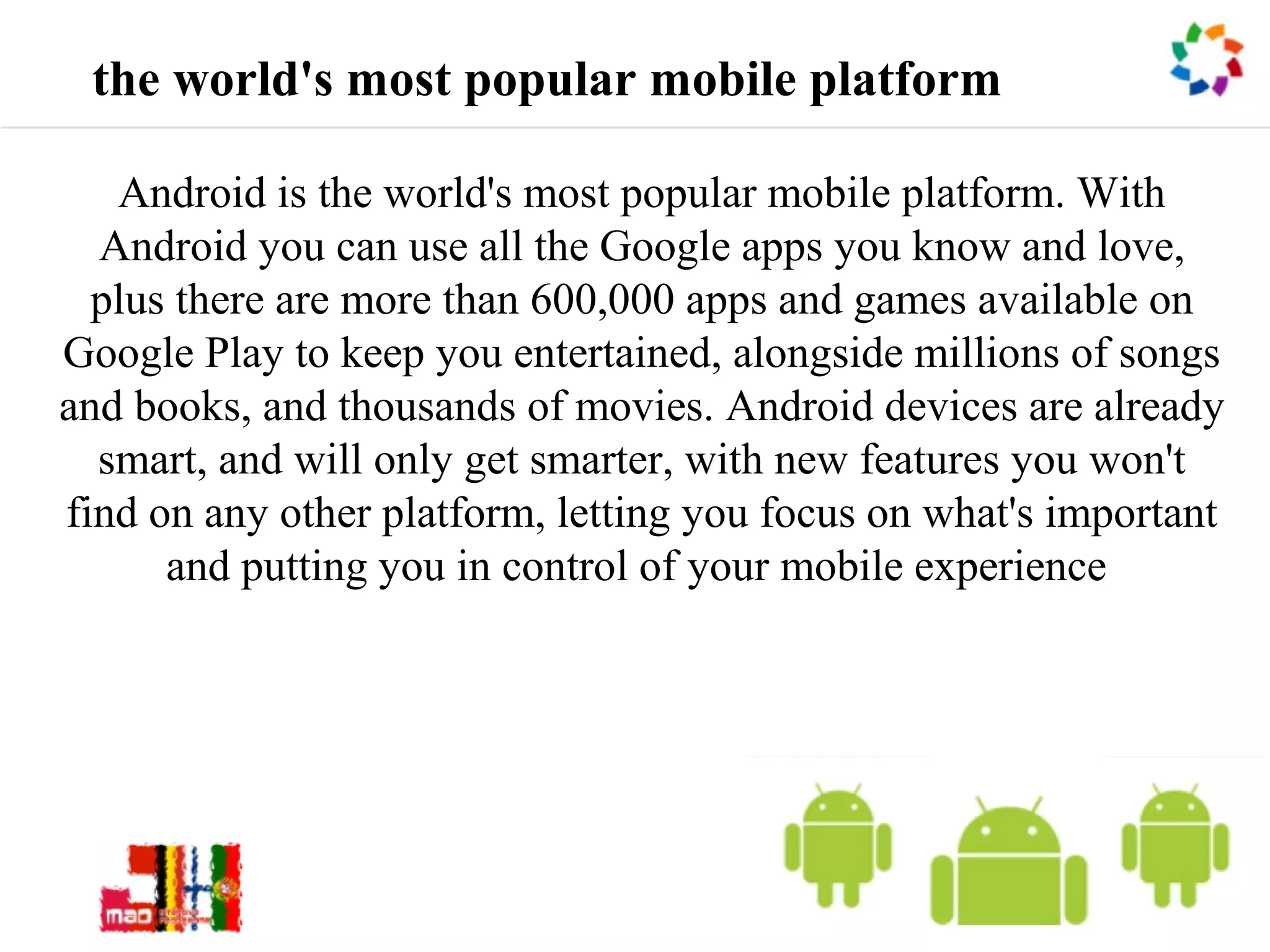 Android is the world's most popular mobile platform, allowing users to use Google apps and access over 600,000 third-party apps and games from Google Play. It powers hundreds of millions of devices globally across 190+ countries. Android devices offer new features not found on other platforms and put users in control of their mobile experience.