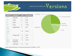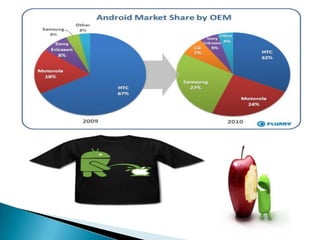 Android is an operating system developed by the Open Handset Alliance led by Google. It runs on smartphones and tablets and is based on the Linux kernel. The document discusses Android's features such as touchscreen support, media capabilities, and connectivity options. It also covers Android applications, the Android Market app store, and recent developments in Android versions including improved multitasking and notifications. The document notes both advantages of Android's open source model and some current limitations.