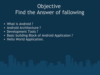 Android is a software platform for mobile devices based on the Linux operating system. It was developed by Google and the Open Handset Alliance. The document then provides a history of Android versions from 1.0 in 2007 to 4.1/4.2 Jelly Bean in 2012. It also describes key Android features like its application framework, Dalvik virtual machine, integrated browser, and hardware integration for graphics, audio, video, Bluetooth, GPS and more. Finally, it outlines the basic building blocks of an Android application like activities, intents, services, content providers and broadcast receivers, and provides an example "Hello World" application code.