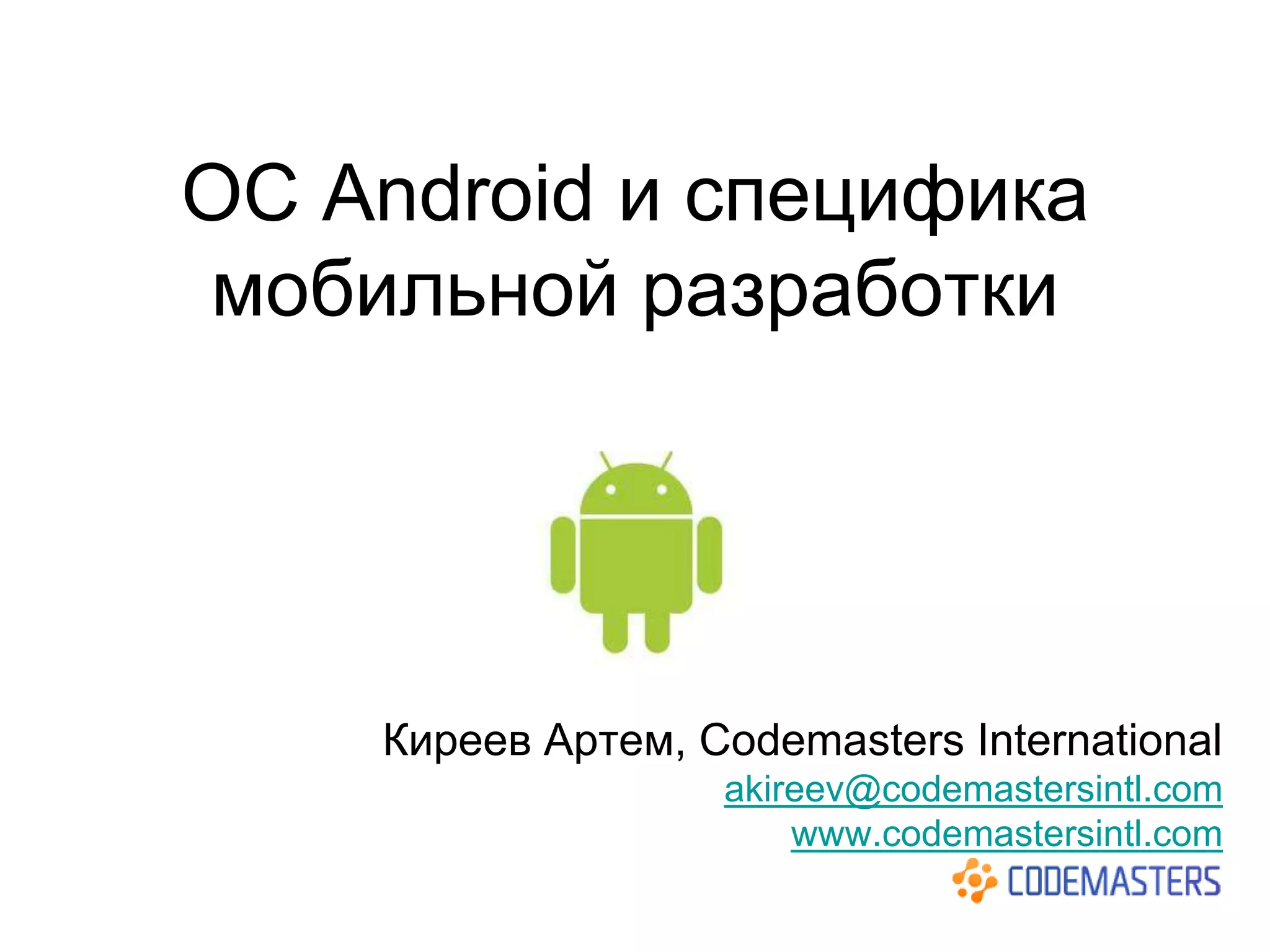 Документ описывает операционную систему Android и важные аспекты мобильной разработки на этой платформе. В нем рассматриваются основные компоненты приложения, особенности работы с различными экранами, взаимодействие между компонентами и использование Google Cloud Messaging для обновления данных. Также присутствует информация о требованиях для разработки и публикации приложений в Google Play.