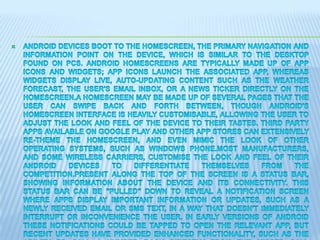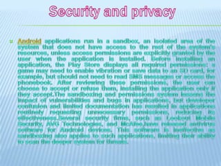 Android is an open source operating system developed by Google and the Open Handset Alliance. It allows device manufacturers and developers to modify and distribute the software. There is a large community of developers creating apps that extend the functionality of Android devices, primarily written in Java. By 2012 there were over 700,000 apps available on Android with over 25 billion downloads from the Google Play store.