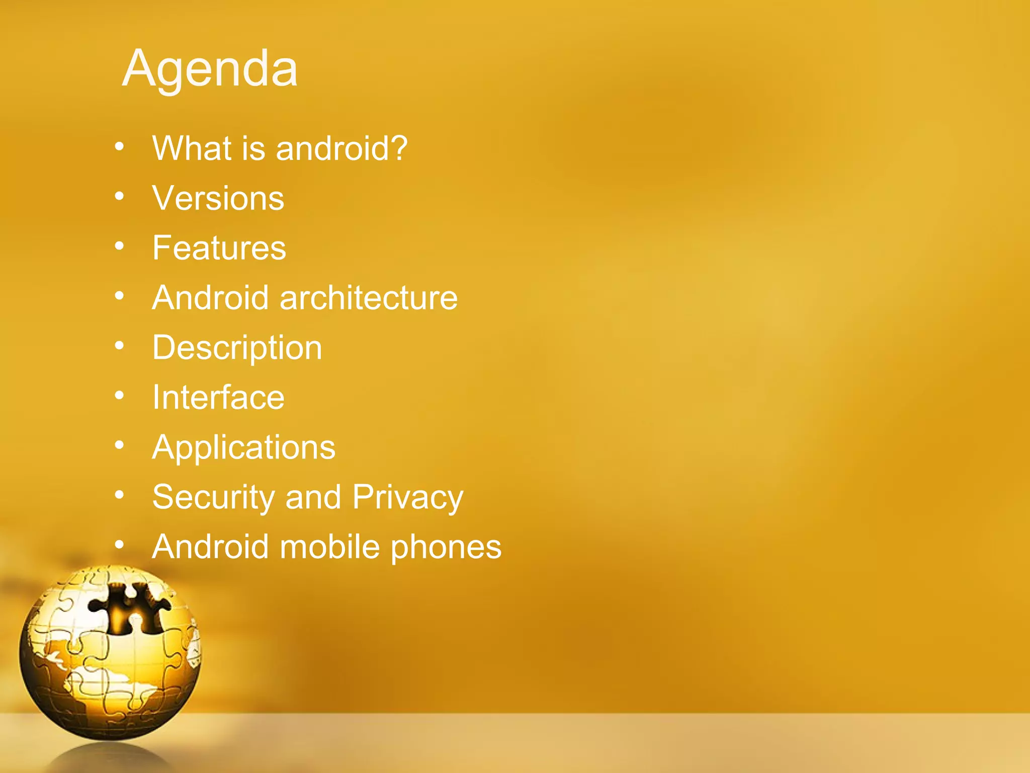 This document provides an overview of the Android operating system. It describes Android as a Linux-based operating system developed by Google and the Open Handset Alliance for use in smartphones and tablets. The document then discusses the major versions of Android, its key features like applications, architecture, interface, and security. It also profiles some popular Android phones like the Samsung Galaxy S3, HTC One X, and Motorola Droid Razr Maxx.