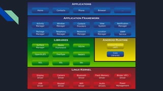 This document provides an overview of Android and Kotlin for mobile app development. It discusses Android versions and history starting from 2008. It also covers Kotlin as a modern programming language that is fully compatible with Java and highly integrated with Android. The document demonstrates basic Kotlin syntax and concepts. It provides examples of how to write Android apps using Java or Kotlin in Android Studio, including activities, layouts, intents, and the recycler view. It also briefly introduces architectural concepts like MVVM and libraries like Retrofit for network requests.