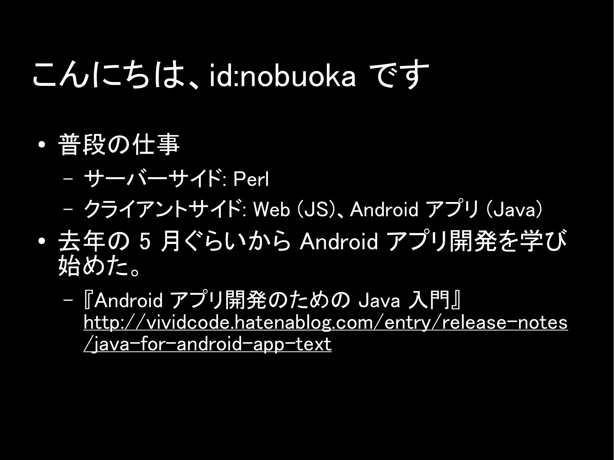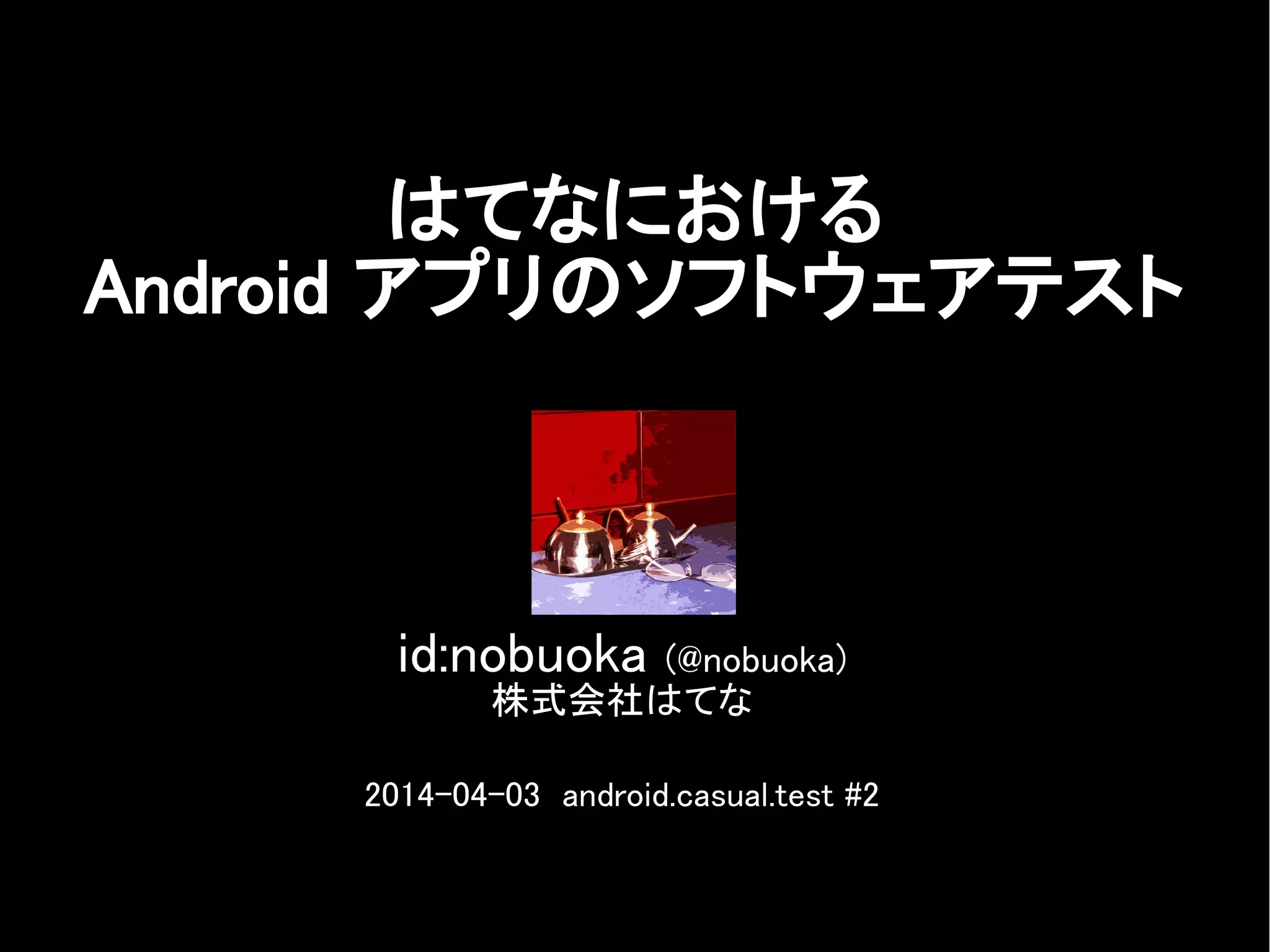 android.casual.test #2 の発表資料です。 LT 内容の補足も含めた勉強会全体の感想などは次の記事を参照してください: http://vividcode.hatenablog.com/entry/study-meeting/android-casual-test-2