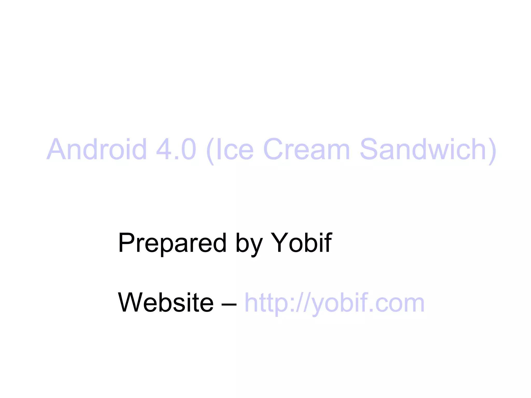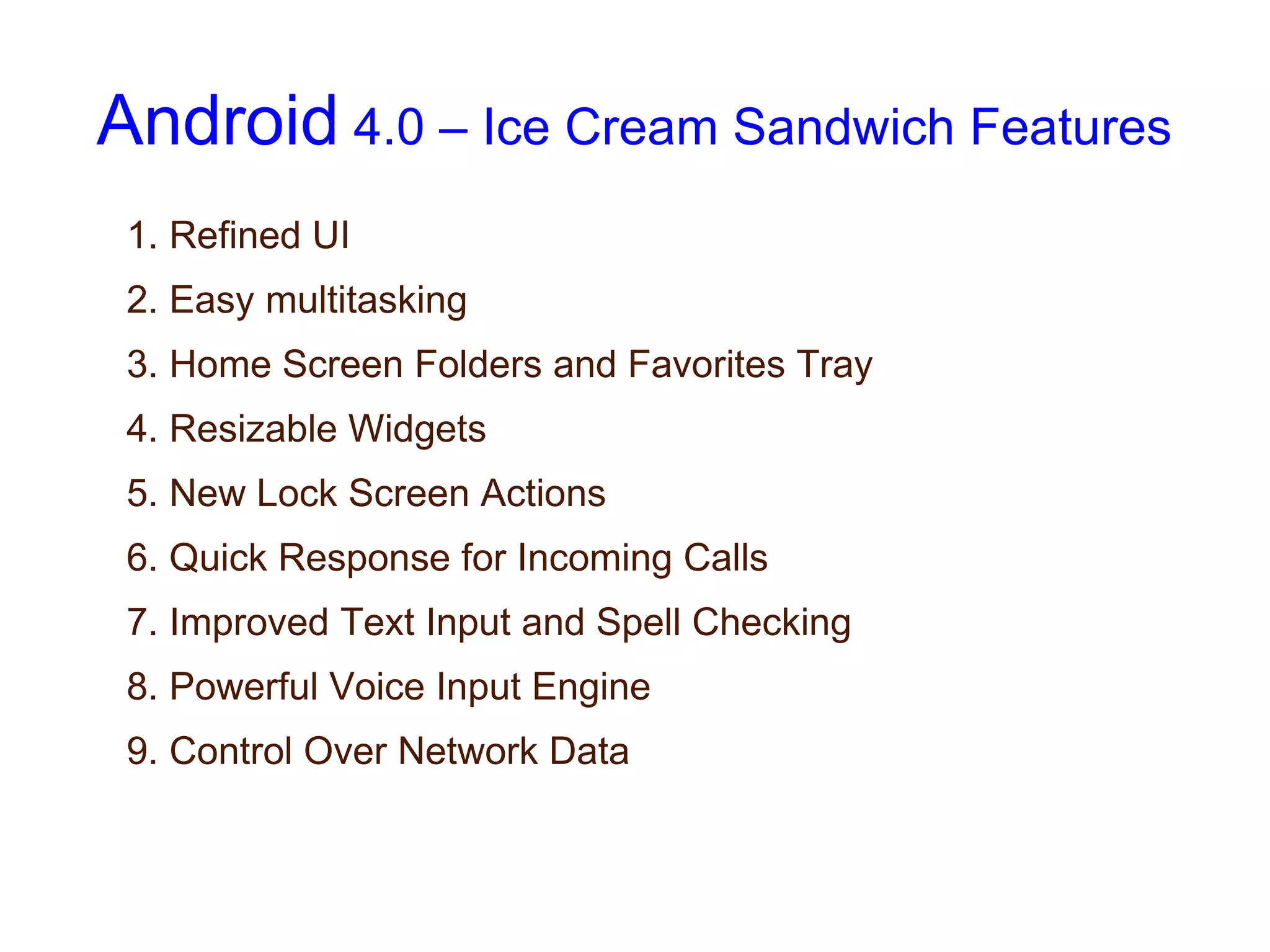 Android 4.0 (Ice Cream Sandwich) introduced several new features including a refined user interface with new widgets, lock screen actions, improved multitasking, text input and spell checking, voice recognition, and controls for network data usage. It also included enhancements to the camera, gallery app with photo editing, live video effects, screenshot sharing, web browsing, and face unlock capabilities.
