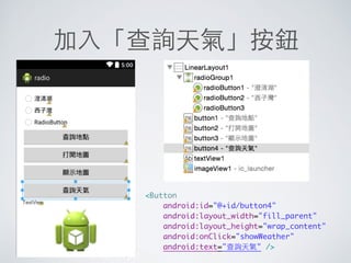 本文件介绍了Android应用程序开发的基础知识,包括开发环境的设置、用户界面的设计方法、按钮和事件处理、以及调试和日志记录。它详细说明了使用Intent进行页面跳转和使用AsyncTask处理多线程操作。同时文档还提供了与网络交互的示例,如获取天气信息和执行网络请求。