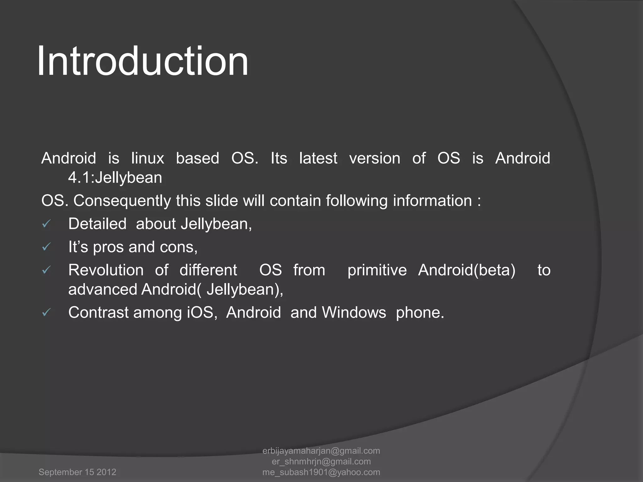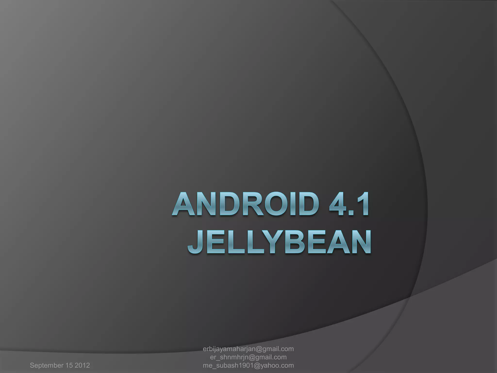 The document discusses Android Jellybean OS (version 4.1). It provides an overview of Android and its history from initial development to the latest Jellybean version. Key features of Jellybean like improved notifications, voice recognition and Google Now are described. Comparisons are made between Android, iOS, and Windows phones. The conclusion states that Jellybean is the best Android version yet but has limited availability and few tablet-friendly apps.