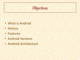 Android is an open source software platform and operating system for mobile devices. It was developed by Android Inc., which was acquired by Google in 2005. Android allows developers to write code in Java and uses the Linux kernel. It supports running multiple apps simultaneously, optimized graphics, and a large app market. The Android architecture includes the Linux kernel, native libraries, Dalvik virtual machine, application framework, and applications.