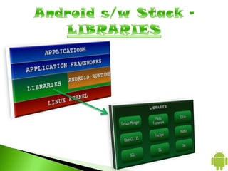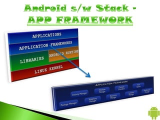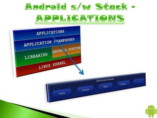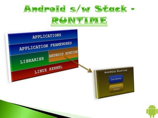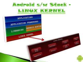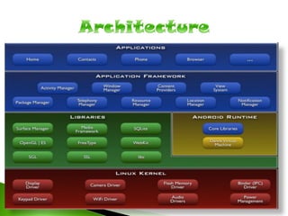 Android is an open source software stack for mobile devices that includes an operating system, middleware and key applications. It was developed by Android Inc which was acquired by Google in 2005. The Android software development is led by the Open Handset Alliance, a consortium of technology companies including Google, HTC, Intel, and T-Mobile. Some key features of Android include an open development platform, availability of third party applications, and a compound architecture inspired by internet mash-ups.