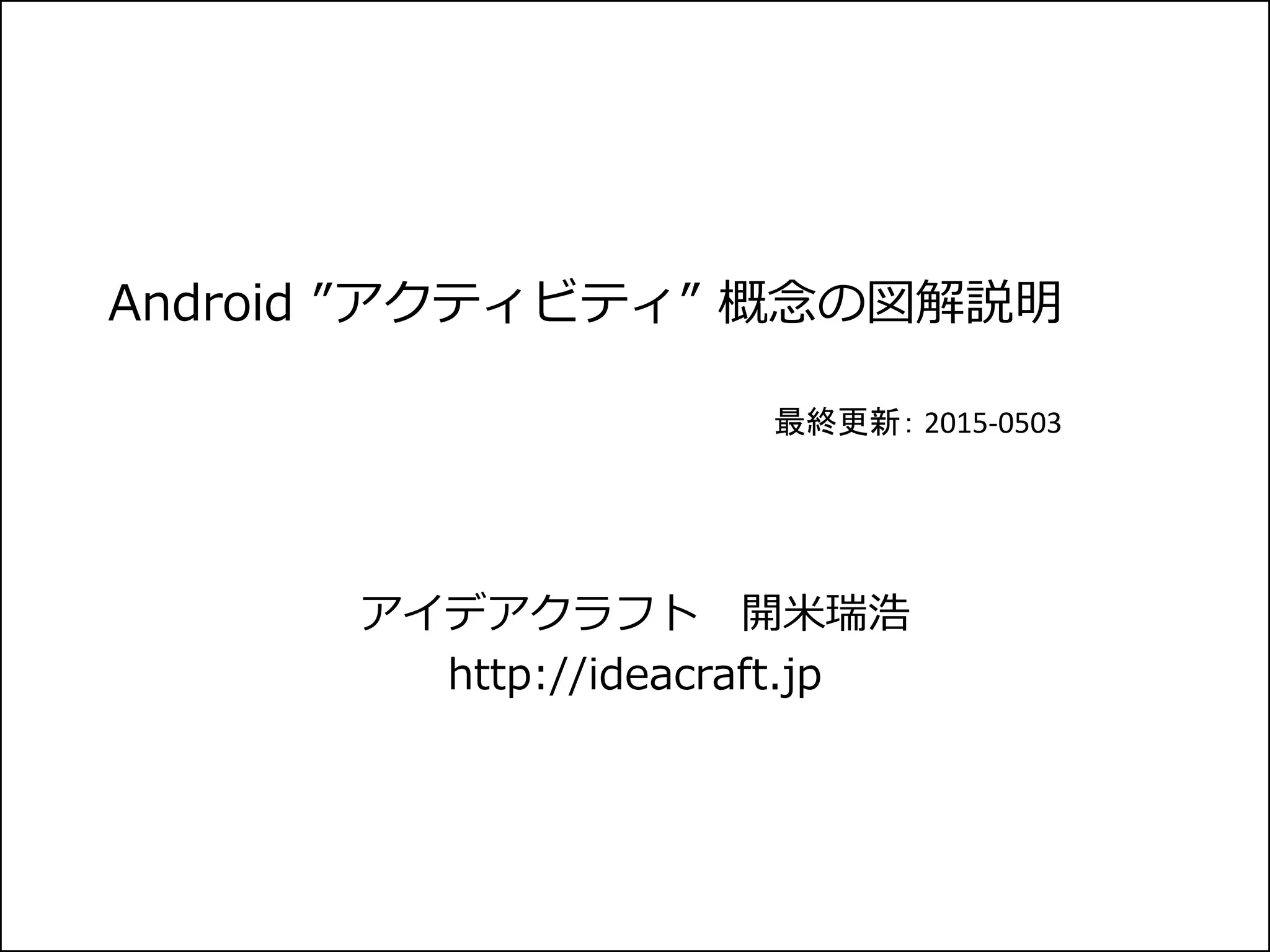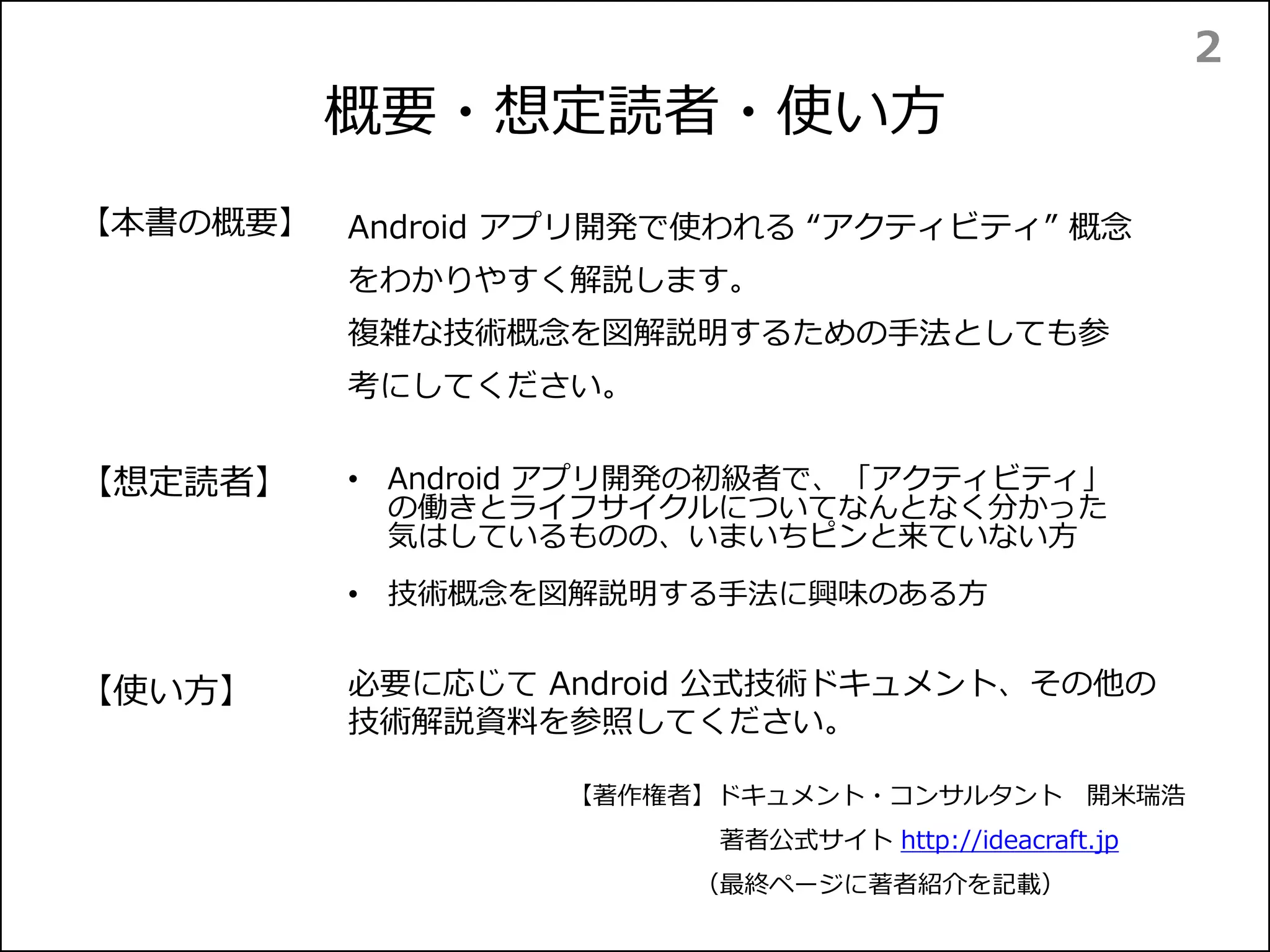 概念 をわかりやすく解説します。 複雑な技術概念を図解説明するための手法としても参 考にしてください。 必要に応じて Android 公式技術ドキュメント、その他の 技術解説資料を参照してください。 • Android アプリ開発の初級者で、「アクティビティ」 の働きとライフサイクルについてなんとなく分かった 気はしているものの、いまいちピンと来ていない方 • 技術概念を図解説明する手法に興味のある方 【著作権者】ドキュメント・コンサルタント 開米瑞浩 著者公式サイト http://ideacraft.jp (最終ページに著者紹介を記載) 【使い方】 【本書の概要】 【想定読者】 2