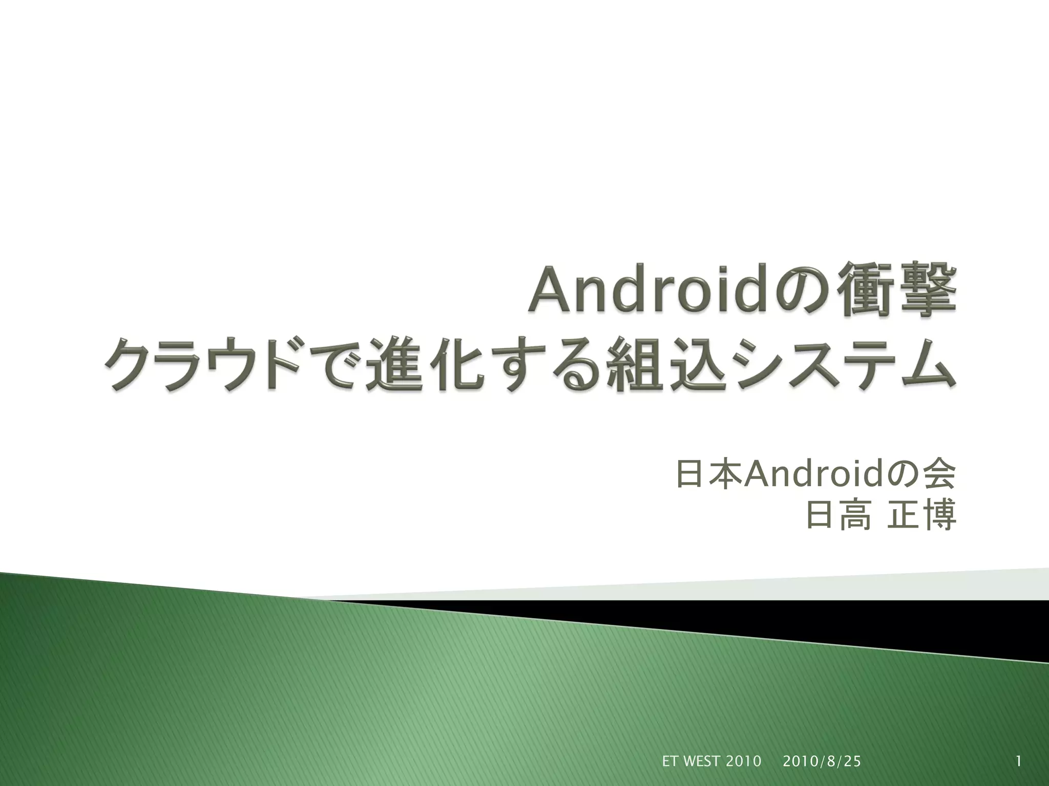 日高 正博(ひだか まさひろ) ◦ 日本Androidの会/関西支部 Android開発情報サイト Tech Booster 運営 http://techbooster.jpn.org/ Twitter Account @mhidaka ET WEST 2010 2010/8/25 2
