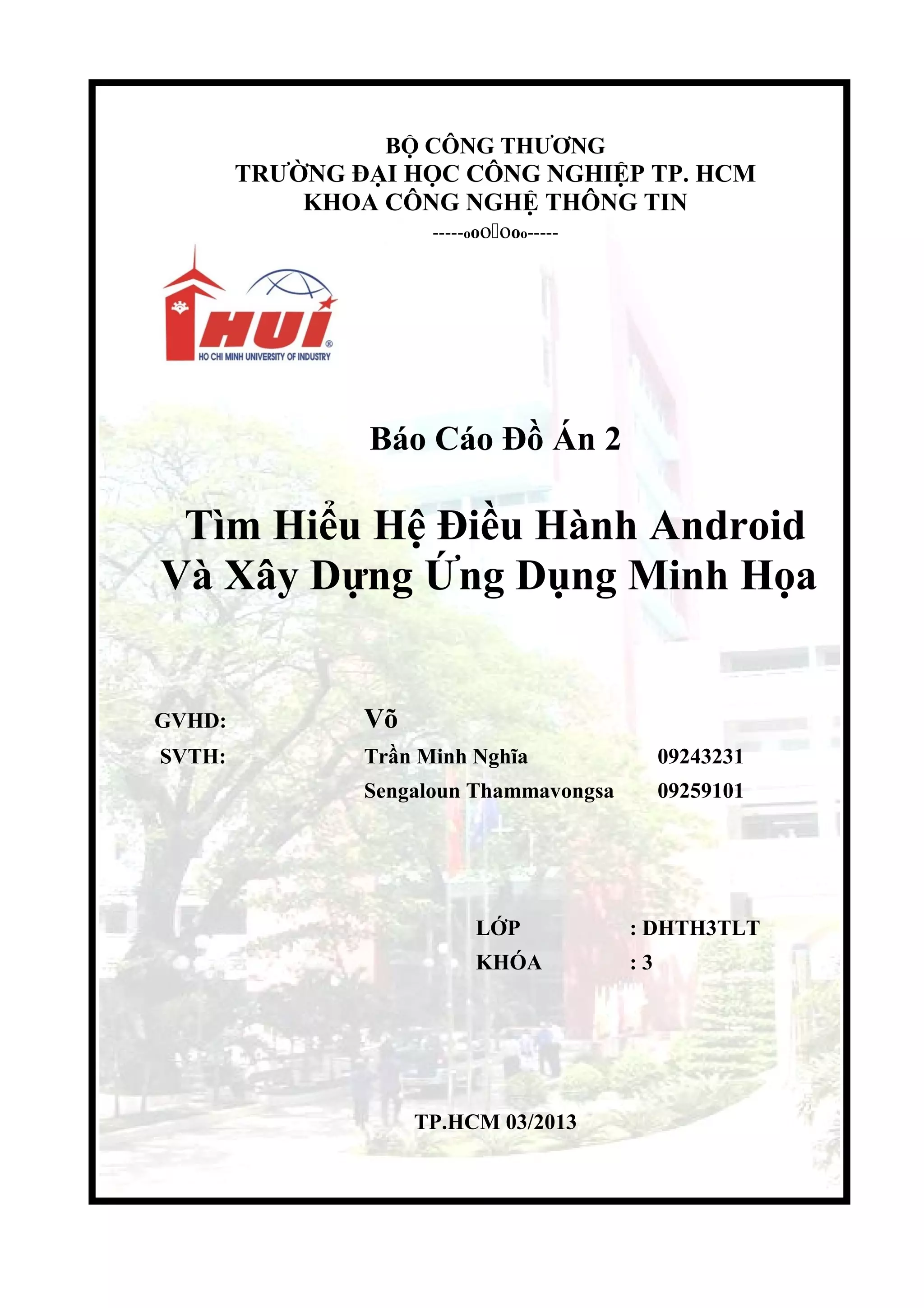 Tài liệu này là một báo cáo nghiên cứu về hệ điều hành Android và cách xây dựng ứng dụng minh họa. Nó bao gồm lịch sử phát triển, kiến trúc và môi trường lập trình của Android, đồng thời nhấn mạnh tính mở và sự phổ biến của hệ điều hành này trong cộng đồng phát triển. Mặc dù có nhiều thông tin, nhưng tài liệu vẫn còn những thiếu sót do hạn chế về thời gian và kinh nghiệm thực hiện.