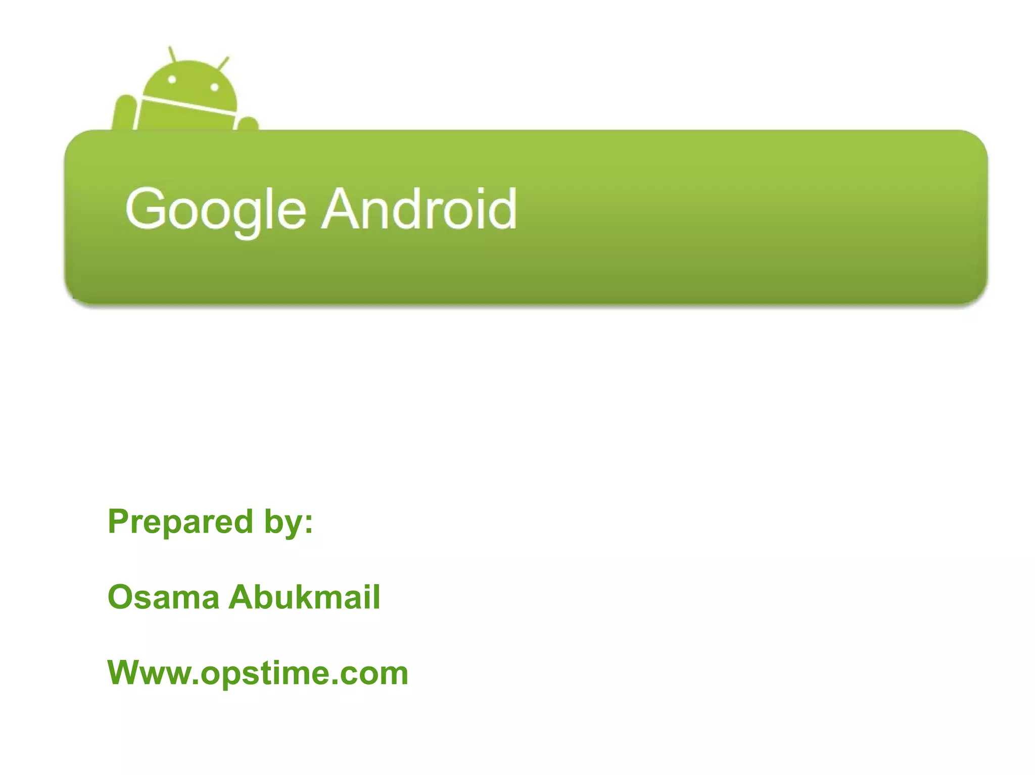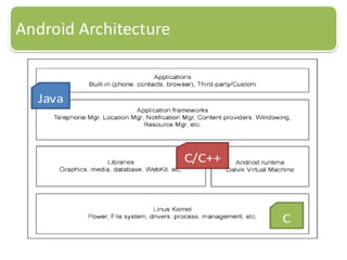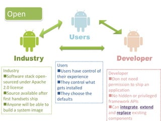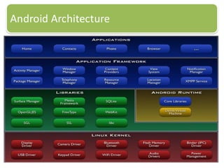 Android is an open source operating system based on Linux that was developed by Google. It aims to provide a rich experience for mobile users. The Android platform is the product of the Open Handset Alliance led by Google to build better mobile phones. The Android SDK contains tools and documentation to help developers build Android applications, including the Android emulator to test apps without a physical device. Key benefits are the open platform and free licensing, while challenges include performance and vendor integration. Market response will be a key factor.