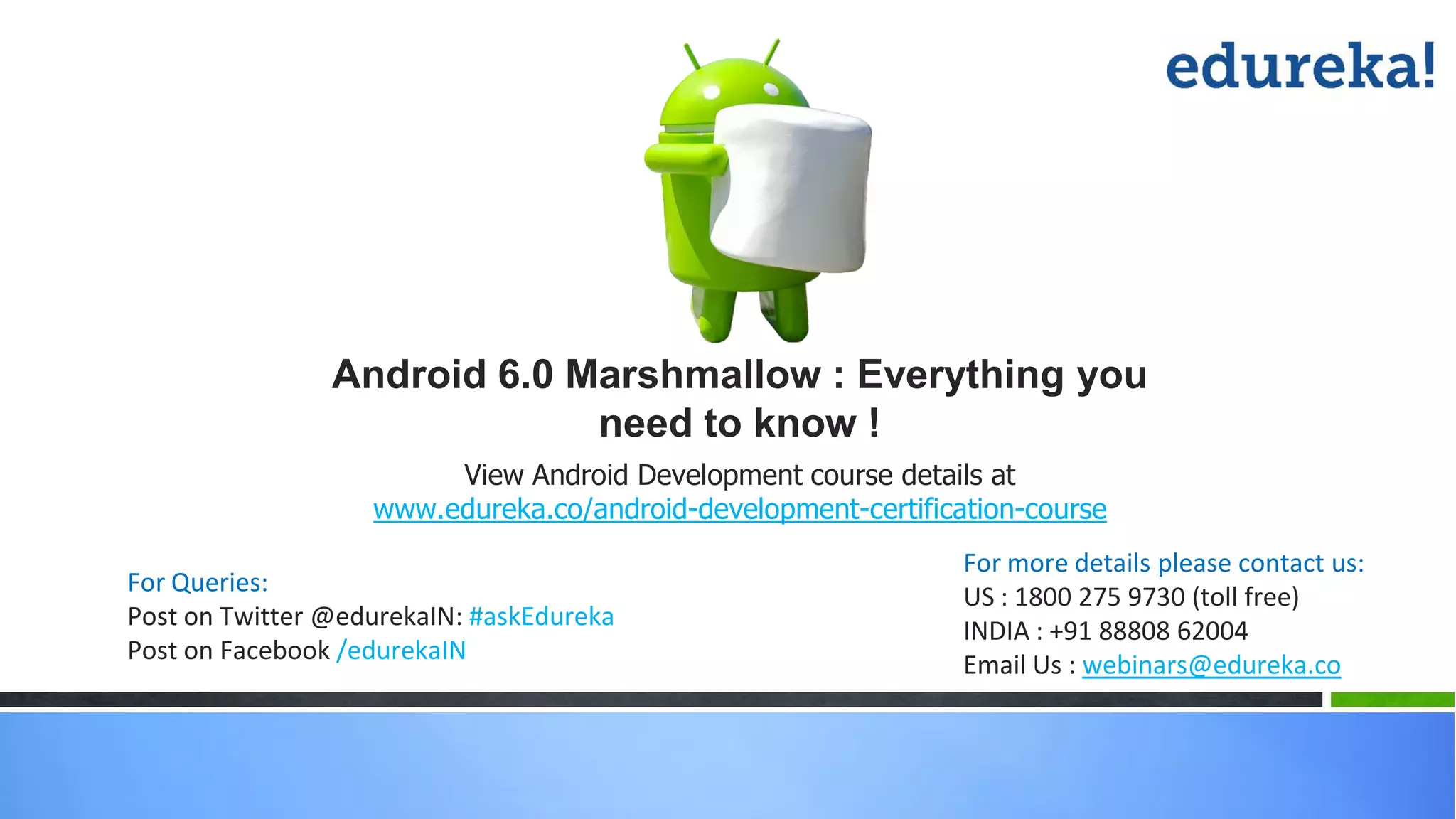 This document discusses features introduced in Android 6.0 Marshmallow. It covers Data Binding, which provides a mechanism for linking UI layouts to data sources. It also discusses Android Percent Layout for setting child view dimensions as percentages. Additionally, it covers Runtime Permissions, which allow apps to request permissions at runtime instead of install time. App Linking and Direct Share are also new sharing features introduced in Android M.