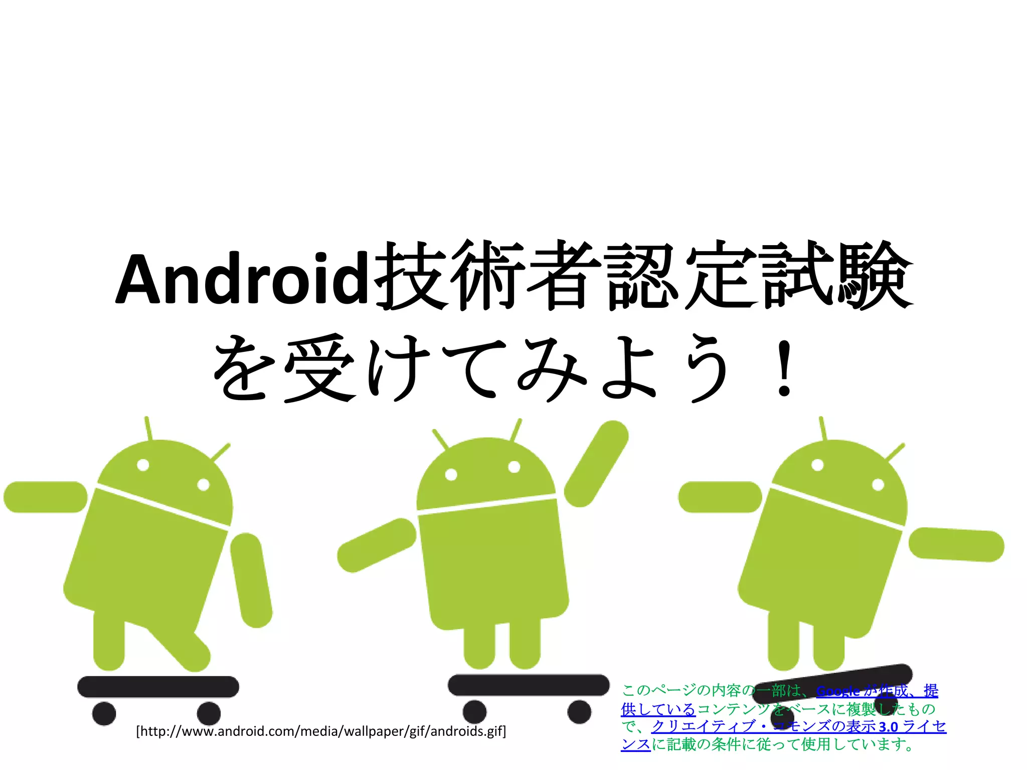Android技術者認定試験を受けてみよう!このページの内容の一部は、Google が作成、提供しているコンテンツをベースに複製したもので、クリエイティブ・コモンズの表示 3.0