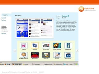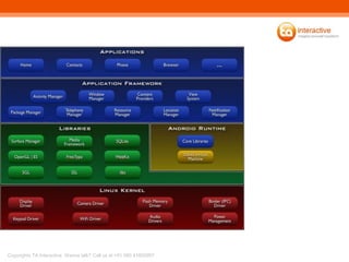 Android is an open source software platform and operating system for mobile devices based on the Linux kernel. It has seen several updates since its original release, including Cupcake, Donut, Eclair, and others. Android allows developers to publish applications to the Android Market without approval, unlike Apple's App Store which requires a month-long approval process. The Android SDK includes development tools like an emulator, plugins for the Eclipse IDE, and DDMS for debugging applications in the Android runtime environment.