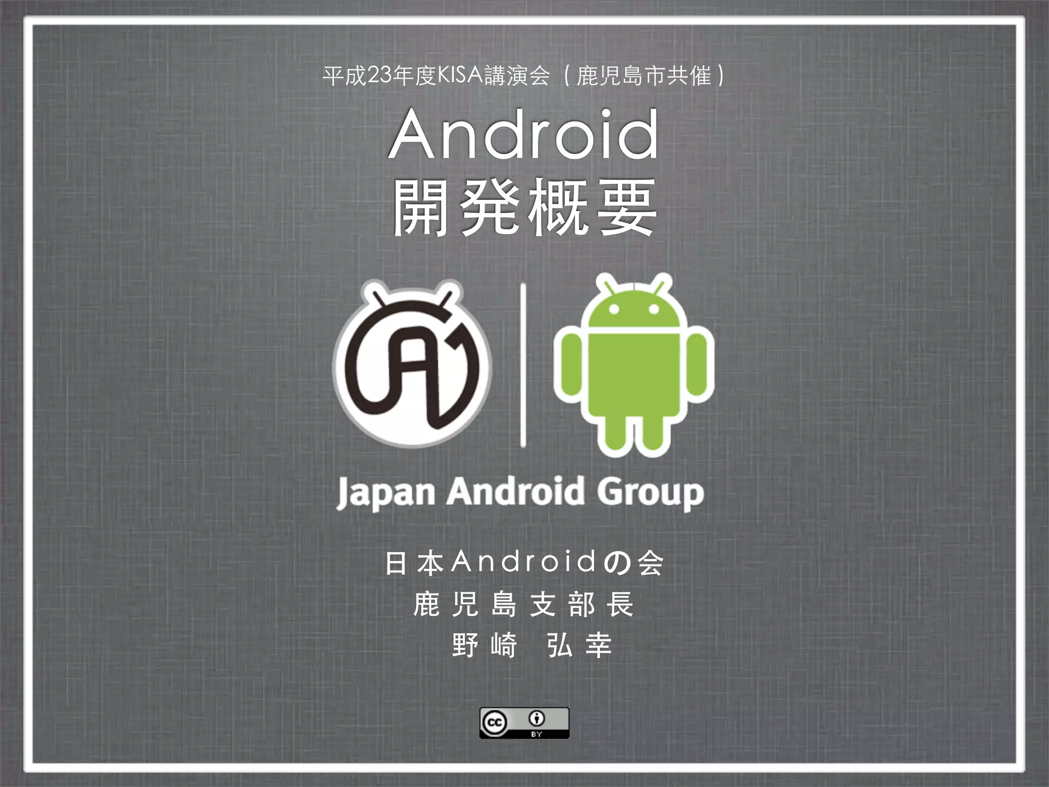 この講習のテーマ Android開発の基礎について説明します。 本日は、実際のプログラミングの手前までです。 開発者の方は、この講習の後、ぜひ、手を動かして、 コードを書いて、Androidの開発をはじめて下さい。 6月末∼9月初旬の全6回で、 ハンズオン形式の講習会も予定されています。 日本Androidの会鹿児島支部としても定期的に勉強会を 行っています。 http://bit.ly/JAGK-ML
