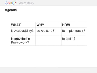 The document provides guidelines on designing accessible Android applications, emphasizing the importance of accessibility for the approximately 1 billion users with special needs. It outlines various framework features and tools available, such as TalkBack and BrailleBack, to enhance user interaction and feedback. The document also includes recommendations for code changes, testing, and debugging to ensure compliance with accessibility standards.