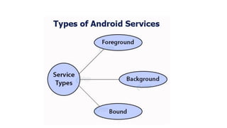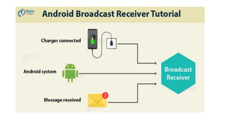 4) Broadcast receivers respond to broadcast messages from other apps or the system to perform tasks when apps are not active. The document provides examples of how to implement each component.