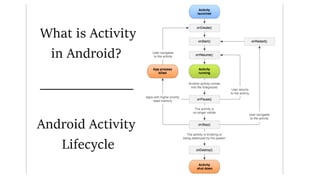 1) Activities represent single screens and are independent of each other. The activity lifecycle callbacks like onCreate(), onStart(), onResume(), onPause(), onStop(), and onDestroy() are explained.