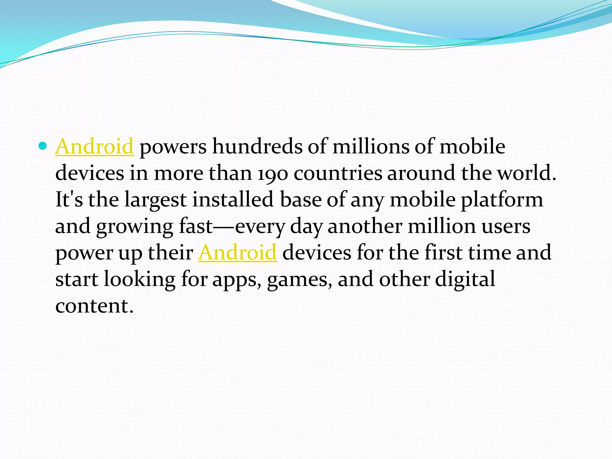 Android powers hundreds of millions of mobile devices around the world, providing developers with tools to build apps and games for the large user base. As the most popular mobile platform, Android offers an open marketplace in Google Play to distribute apps, with over 1.5 billion downloads per month. The document outlines new user features in Android like improved text input, power management, and app controls, as well as tools for developers to optimize apps and reach users worldwide through Google Play.