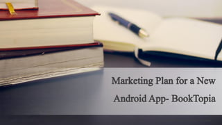 This document provides a marketing plan for a new Android app called BookTopia, which aims to connect people interested in lending and borrowing books. The plan outlines the company overview, strategic assets, target customers and segments, opportunities and threats. It proposes a freemium pricing model with free and premium subscriptions. The marketing strategies include generating awareness through book clubs and ambassadors, and leveraging social media, ads and partnerships. The plan estimates annual traffic, revenue goals and timelines to establish the brand as a leading online book lending platform.