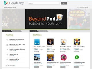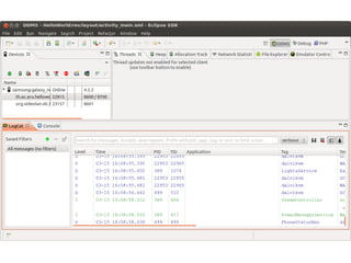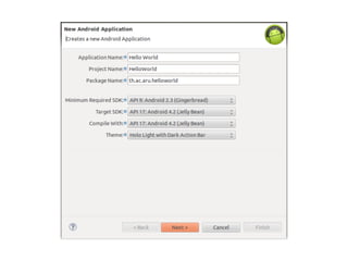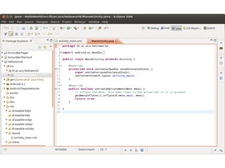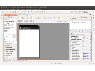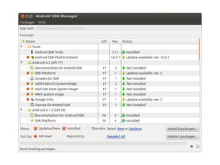 This document provides an overview of Android application development. It begins with prerequisites like Java and version control. It then discusses smartphones and various smartphone platforms like Android, iOS, and Windows Phone. The bulk of the document focuses on Android, explaining what it is, its technical and business advantages, opportunities to monetize apps, and the developer tools needed to get started with Android development within 30 minutes. It provides diagrams of the Android architecture and ecosystem and guides readers through creating a simple first app.